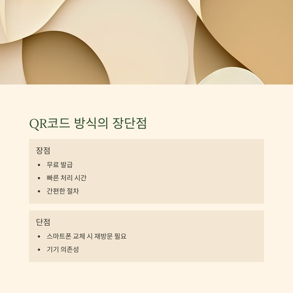 A. QR코드 방식은 주민센터 재방문 필요, IC칩 방식은 앱 연동으로 재발급 가능합니다.